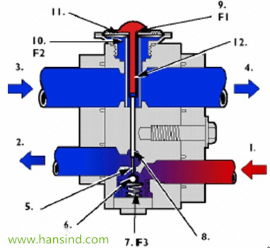 圖中:1、自過濾干燥器 2、到蒸發(fā)器 3、自蒸發(fā)器 4、到壓縮機(jī) 5、測量孔 6、球 、7彈簧 8、活動(dòng)腳 9、制冷劑 10、薄膜下壓力補(bǔ)償 11、金屬薄膜 12、感溫元件