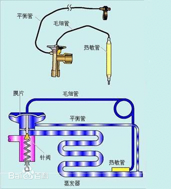 3、感溫包內(nèi)充注制冷劑,放置在蒸發(fā)器出口管道上,感溫包和膜片上部通過毛細管相連,感受蒸發(fā)器出口制冷劑溫度,膜片下面感受到的是蒸發(fā)器出口壓力。如果空調(diào)負荷增加,液壓制冷劑在蒸發(fā)器提前蒸發(fā)完畢,則蒸發(fā)器出口制冷劑溫度將升高,膜片上壓力增大,推動閥桿使膨脹閥開度增大,進入到蒸發(fā)器中的制冷劑流量增加,制冷量增大;