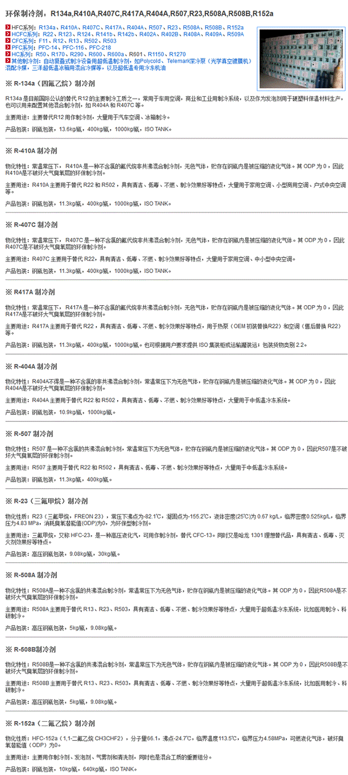 目前環(huán)保節(jié)能的方式,傾向于更高的智能化,變頻控制與運行,還有一個重要的條件是使用環(huán)保冷媒,目前有使用R134a,R410A,R404C,等環(huán)保型制冷劑,環(huán)保制冷劑的特性如下。